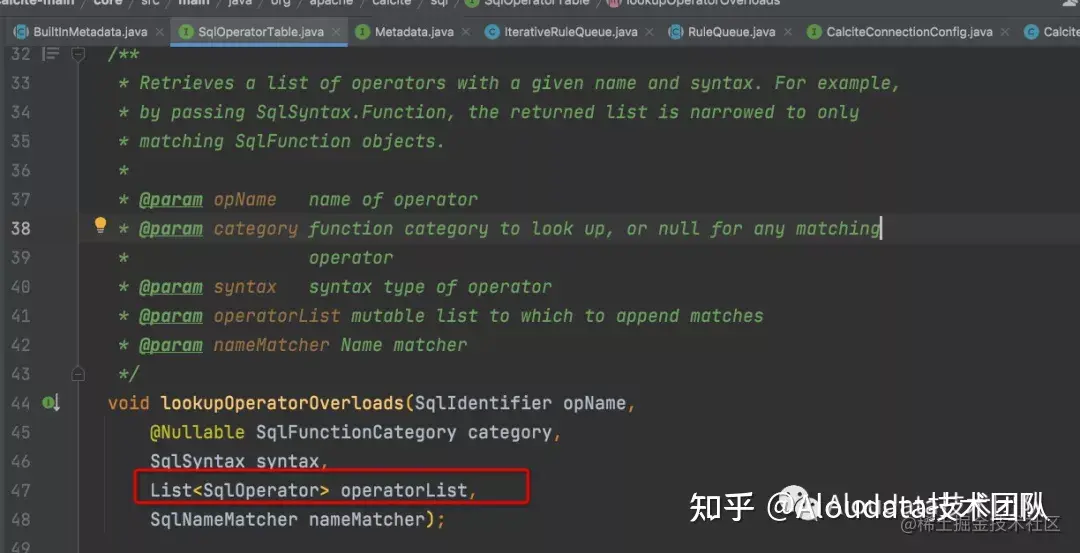 要验证一个 SQL 中用到的函数,我们可以从自定义实现的SqlOperatorTable中进行查找, 一般有两种方法:lookupOperatorOverloads 和getOperatorList ,lookupOperatorOverloads主要逻辑是将某类函数的具体信息查找出来,并添加到输入参数operatorList 集合中。