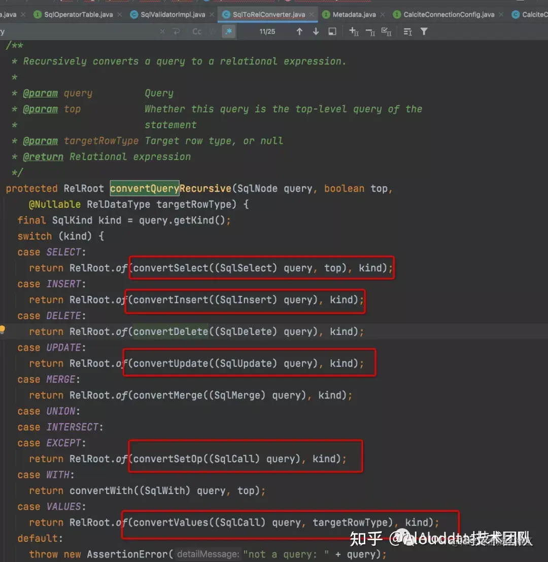 Calcite 使用SqlToRelConverter将SqlNode 转换为RelNode ,其入口方法是convertQuery(),之后会调用convertQueryRecursive方法,底层最终调用 convertXXX 方法(如下图所示),递归遍历抽象语法树将SqlNode 转换为RelNode ,至此,SqlNode 转 RelNode 转换完毕。