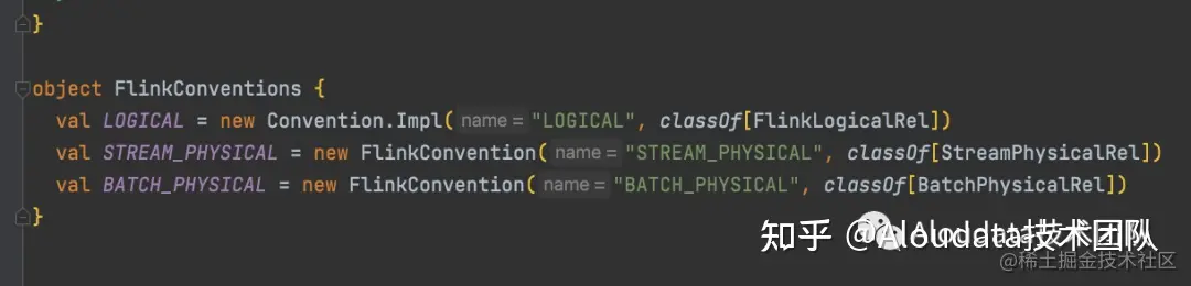 经过 RBO 优化或者物化视图改写之后的执行计划, 本质上还是一个逻辑执行计划,所以这个阶段需要经过 CBO 优化器,选出一个 Cost 最低的物理计划。 既然涉及到 Cost,肯定涉及到 Calcite 的物理转换。在 Calcite 中,该过程通过Convention来进行实现,一般在 CBO 阶段后,我们需要自定义相应的Convention来定义转换逻辑,以下是 Apache Flink 的Convention举例: