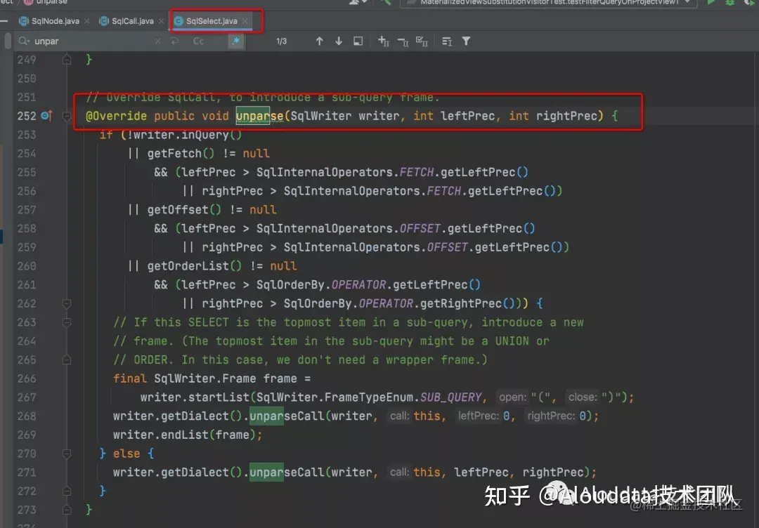 要实现对自定义 SQL 方言的转换,核心是在相应引擎的SqlDialect方言转化类中进行自定义扩展。 默认情况下,每个SqlNode都会有unparse 方法,我们可在此方法中定义其转换为相应 SQL 的实现: