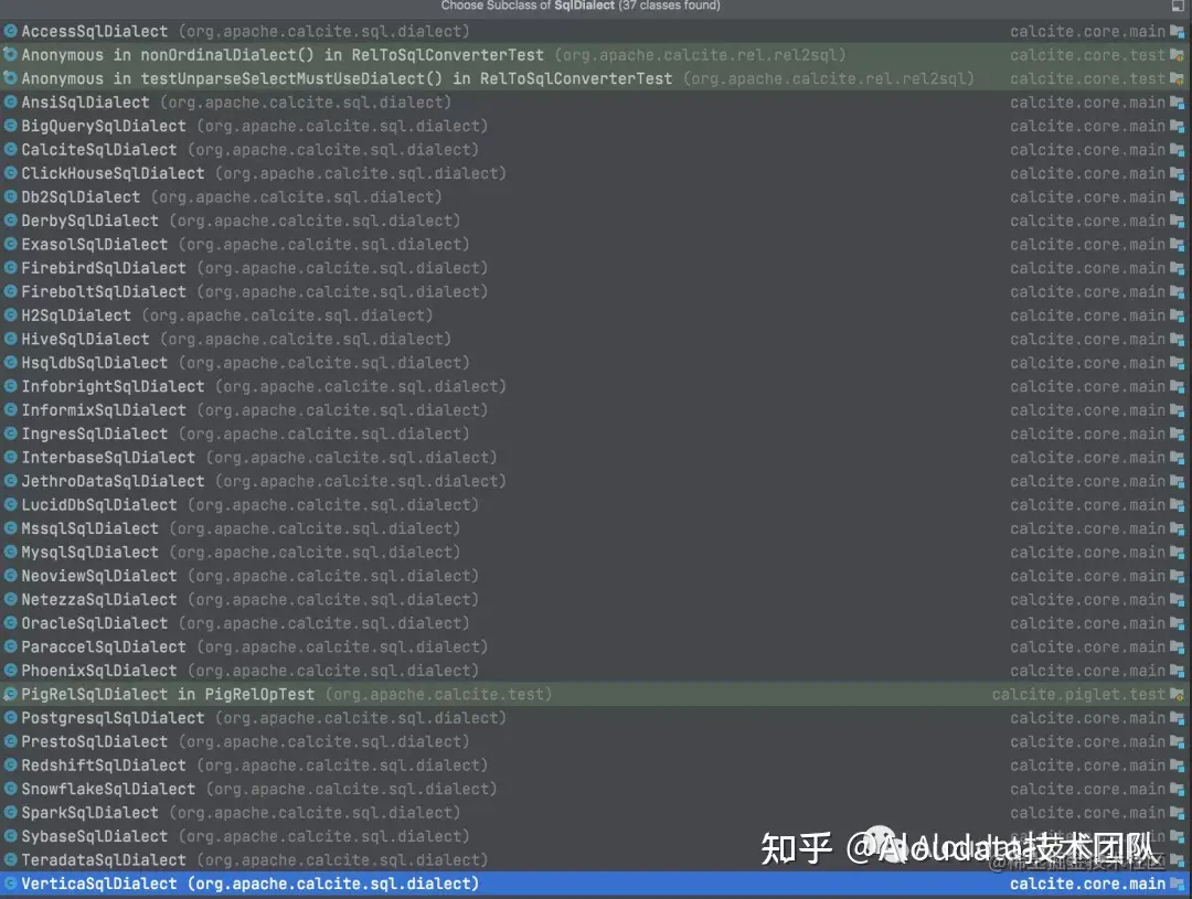 Calcite 中 SQL 方言转换最重要的两个类是RelToSqlConverter 和 SqlDialect ,其中RelToSqlConverter 会将RelNode转换为SqlNode,SqlDialect 则是统一了对 SqlNode方言翻译的所有方法,我们可以自定义复现SqlDialect 的方法,来控制方言转换的具体行为,在 Calcite 内部,已经有很多数据引擎的SqlDialect方言转换的实现,但本身实现逻辑较少,要想生产级别的使用,还需要自定义扩展内部的实现逻辑, 下图是 Calcite 内置的 SqlDialect 类: