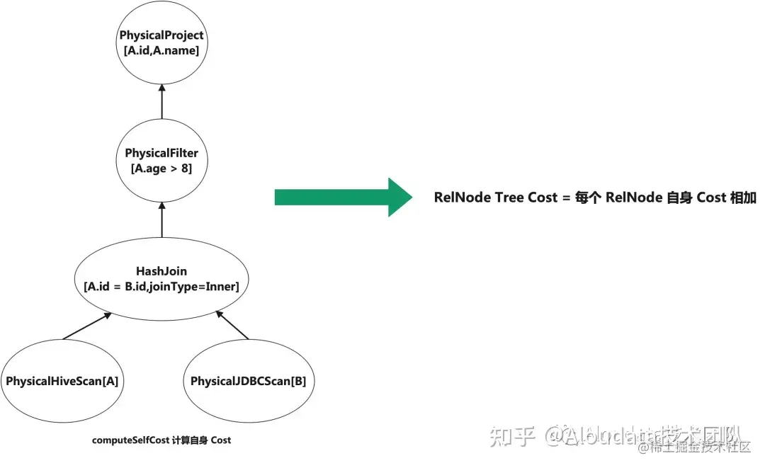 那么一个RelNode Tree 的 Cost 怎么计算呢,在 Calcite 中,RelNode 接口有computeSelfCost 方法,底层具体实现的RelNode,我们可以复写该方法,来计算自身的 Cost 成本。其默认实现为:逻辑计划(LogicalXX 开头),其 Cost 成本为无限大,同时它的 Convention 为Convention.None。一棵RelNode 关系代数 Tree 的成本,就是这棵关系代数 Tree 中所有RelNode节点的自身 Cost 之和,即每个 RelNode computeSelftCost 值相加。
