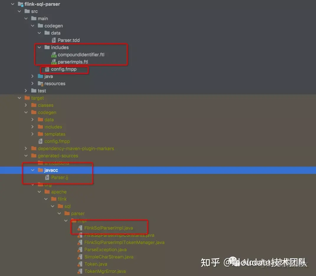 config.fmpp 主要定义 SQL 语法中的关键字、外部引入的类(如自定义的 SqlNode)、以及一些 SQL 解析方法定义等等,具体的实现一般会在 ftl 文件中。以 Apahce Flink 项目举例,组成其 SQL 解析器模块的主要文件如下: