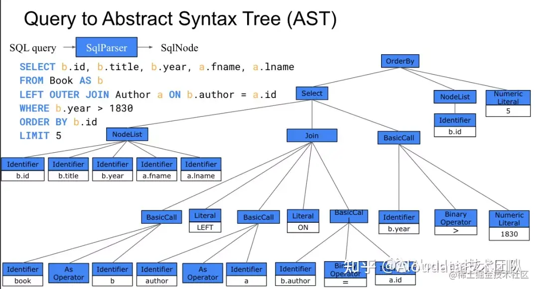 在 Calcite 中,一棵抽象语法树通常用SqlNode来表示。以下面这条 SQL 为例: