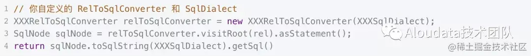 下图是 CalciteRelNode转换为 SQL 方言的示例代码: