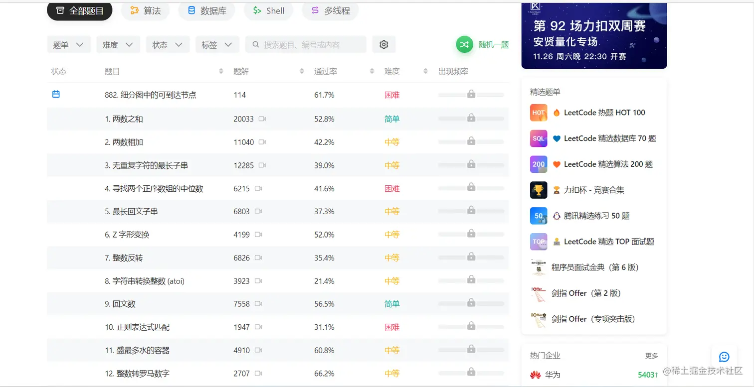 当然,在电面中你也更容易得出最优解、标准解,扎实的算法能力能让你在一众面试者中脱颖而出。LeetCode这个网站就不用多说了吧,家喻户晓,程序员人手一个: