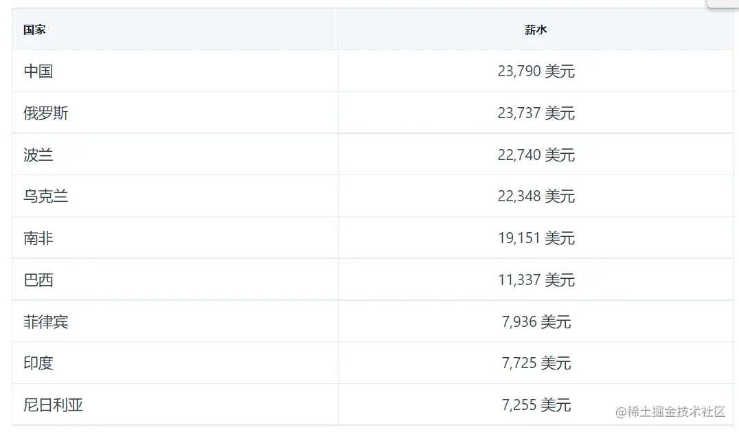 根据CodeSubmit的数据统计,2022年全球软件工程师的平均薪资中,美国的软件工程师薪资水平最高,瑞士和以色列紧随其后,中国则排在第19位,平均薪资水平为 23,790 美元 / 年,约17万人民币。