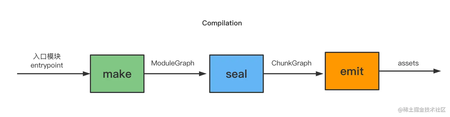webpack 的处理单位是模块,它的编译流程分为 make、seal、emit: