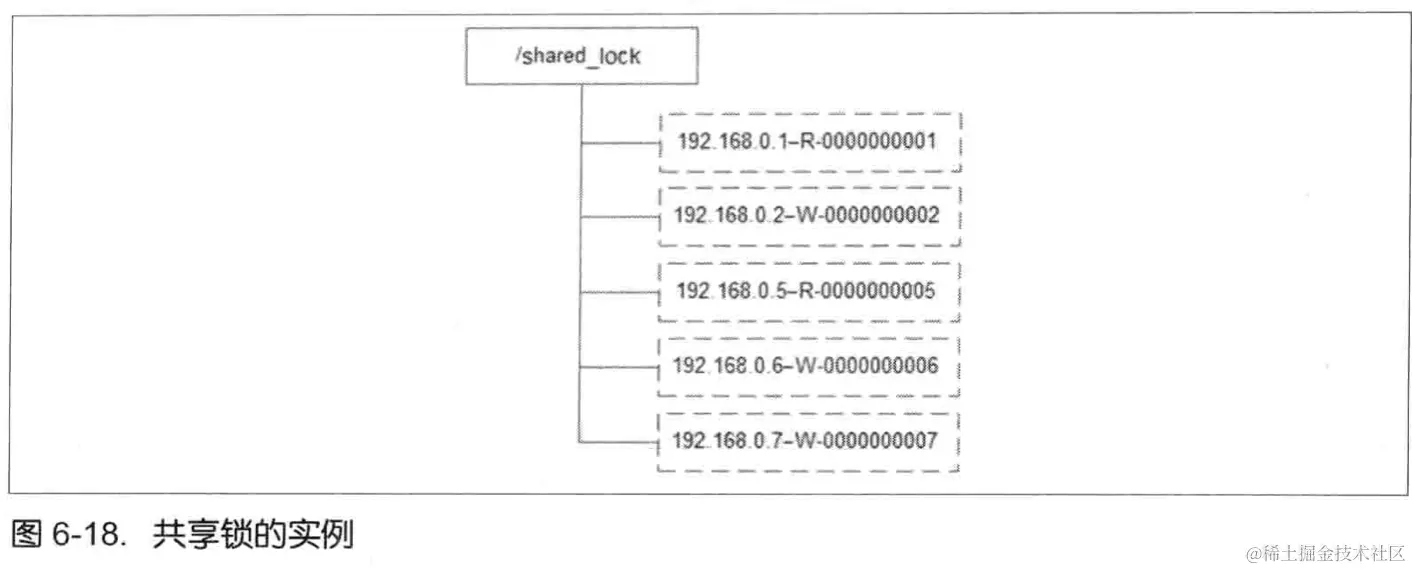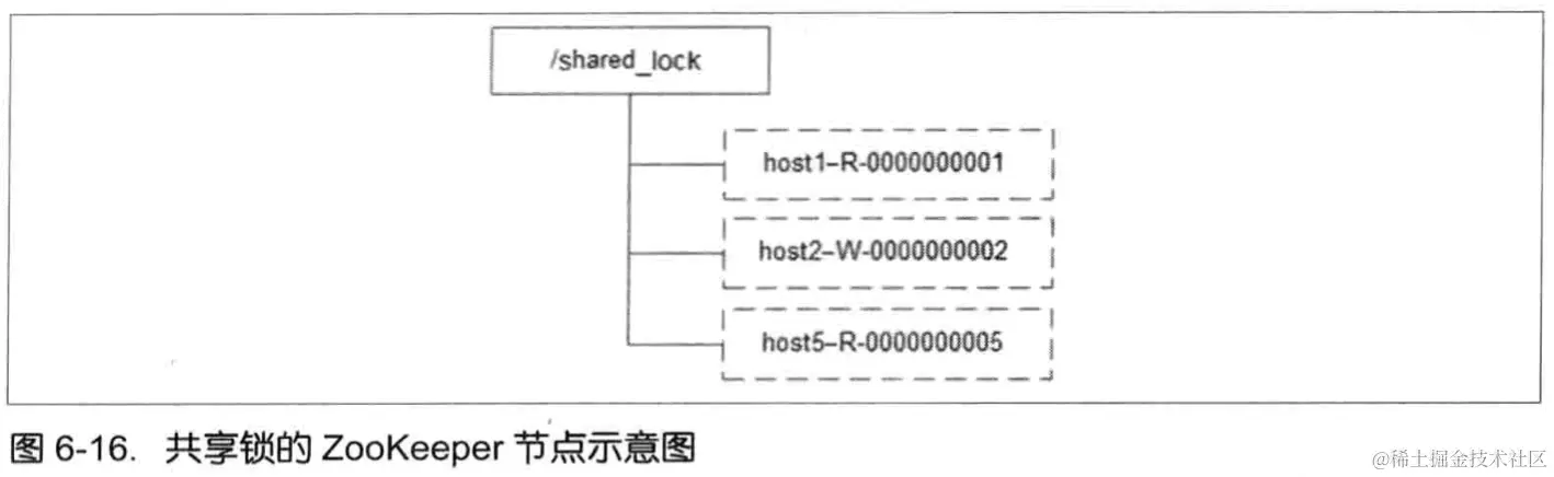 和排他锁一样,同样是通过 ZooKeeper 上的数据节点来表示一个锁,是一个类似于* /shared_lock/[Hostname]- 请求类型-序号”的临时顺序节点,例如/shared_lock/192.168.0.1-R-0000000001,那么,这个节点就代表了一个共享锁,如图 6-16 所示。