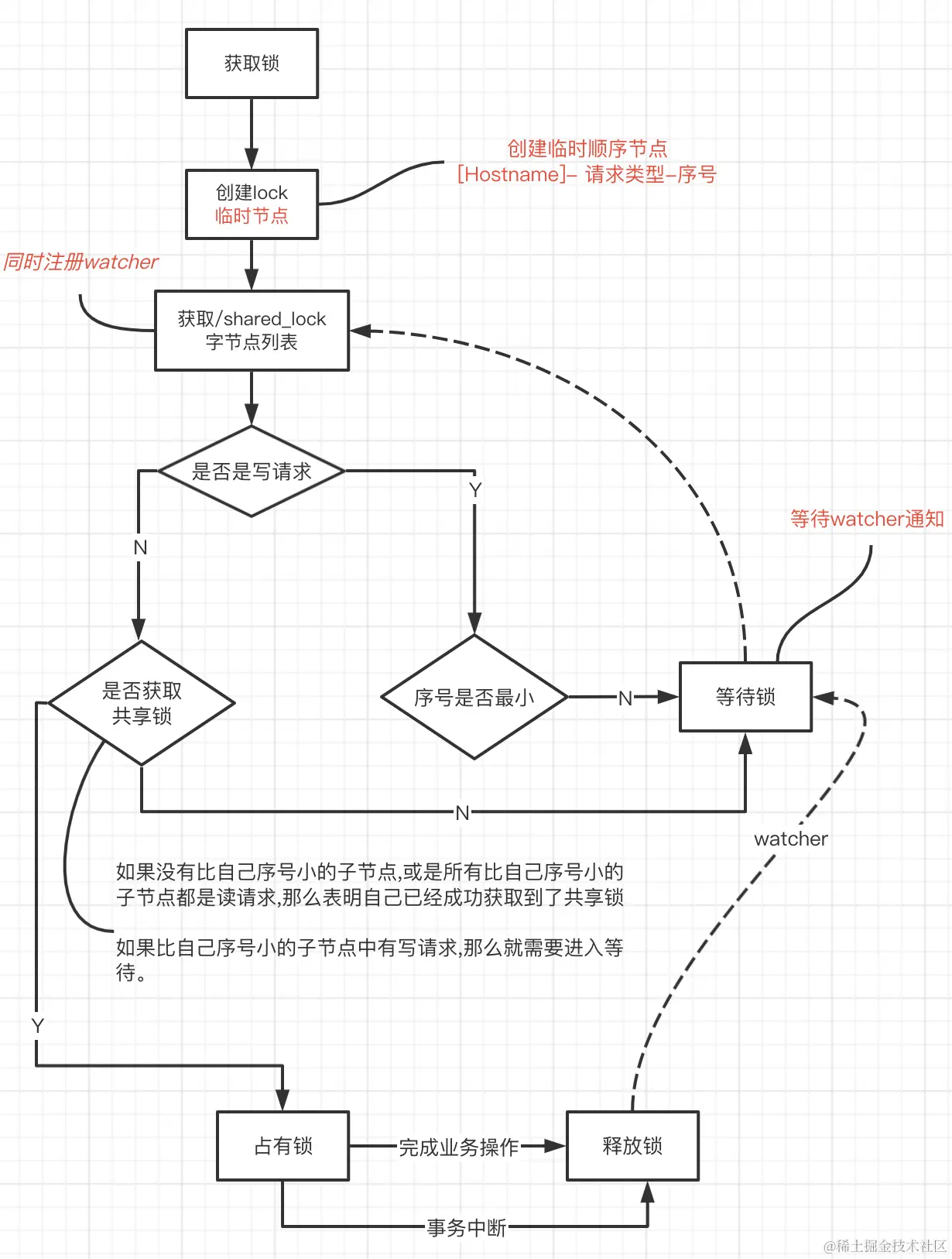 - 如果没有比自己序号小的子节点,或是所有比自己序号小的子节点都是读请求,那么表明自己已经成功获取到了共享锁,同时开始执行读取逻辑。