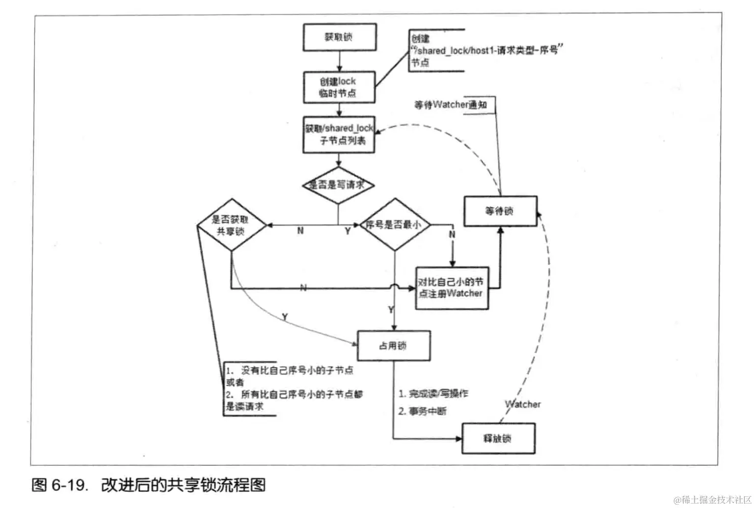 现在我们来看看如何改进上面的分布式锁实现。首先,我们需要肯定的一点是,上面提到的共享锁实现,从整体思路上来说完全正确。这里主要的改动在于:每个锁竞争者,只需要关注/shared_lock节点下序号比自己小的那个节点是否存在即可,具体实现如下。