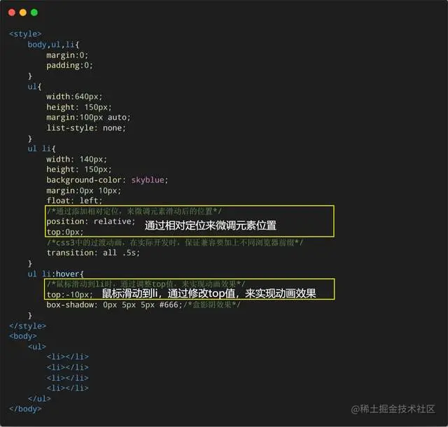当鼠标滑动元素上,元素会向不同方向移动一定距离。我们可以通过给元素添加相对定位,然后鼠标滑上去的时候,通过修改top,tottom,left,right值来调整位置实现动画效果。