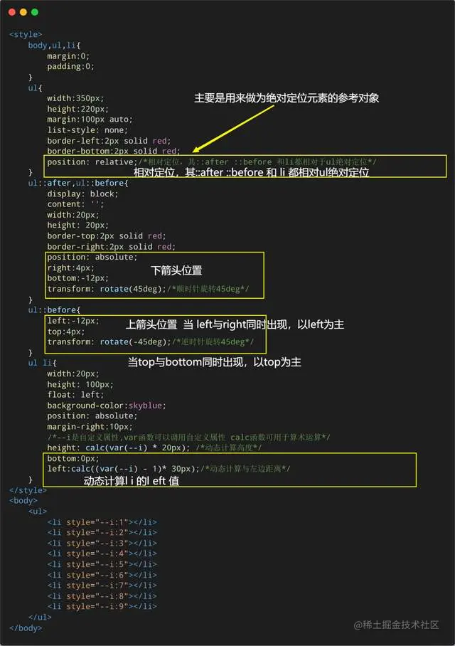 这里的箭头和长方形柱子,都是相对于其父元素来进行绝对定位实现的。