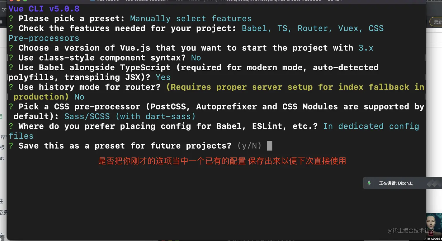 vue 创建Cli项目 前端渣渣木木 2022-12-09 88 阅读1分钟 Vue cli篇 第一步要做的事情就是 全局安装 vue-cli npm install -g @vue/cli # OR yarn global add @vue/cli 创建一个项目 vue create 项目名称 第一进来的时候选择你要的项目配置方案 选择手动选择,然后看到下面的选项 按需求选择 接下来会问你 选用什么vue的版本 然后问你是否使用类组件的写法 选择 N 路由模式 css预处理器 是否保存刚才的操作 按照提示 运行项目