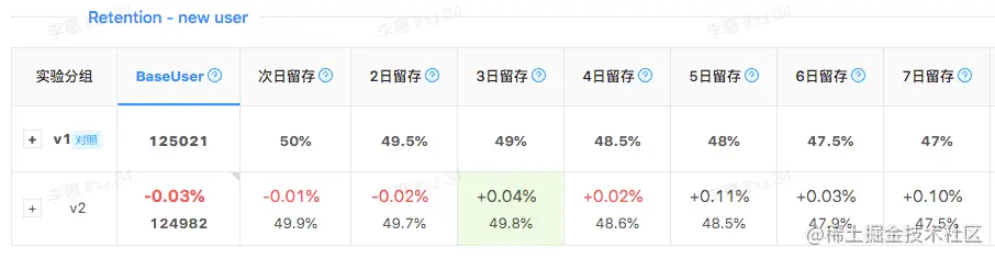- 实验成功指标——新用户留存提升约1%-1.8%,且指标结果呈显著,符合预期;
