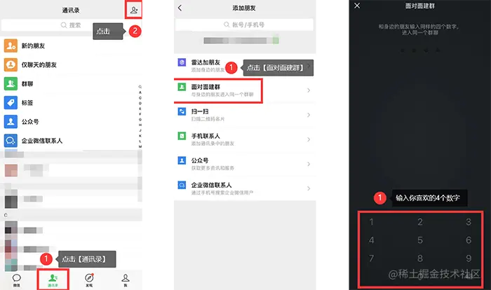 第1步: 点击微信下方的【通讯录】,进入【通讯录】的界面后,点击右上方的【添加好友】图标,之后再选择【面对面建群】。