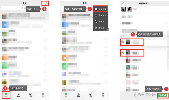 第1步: 点击微信下方的【聊天】,接着点击右上角的【+】按钮,点击选项中的【发起群聊】。