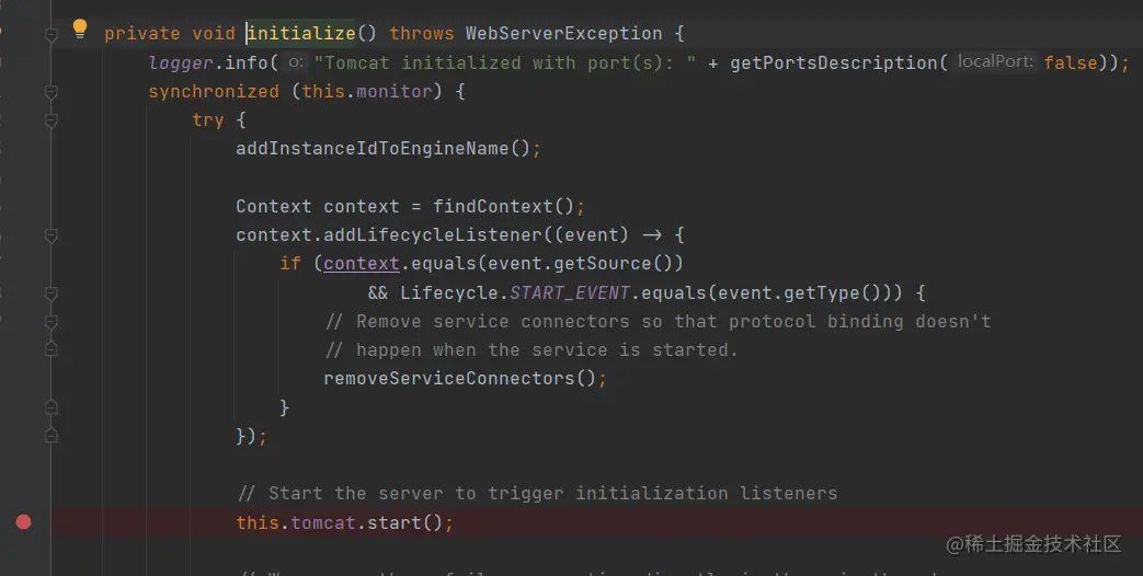 2.8 继续点击 getTomcatWebServer 方法,找到 initialize () 方法,可以看到 tomcat.start (); 启动 tomcat 服务方法。