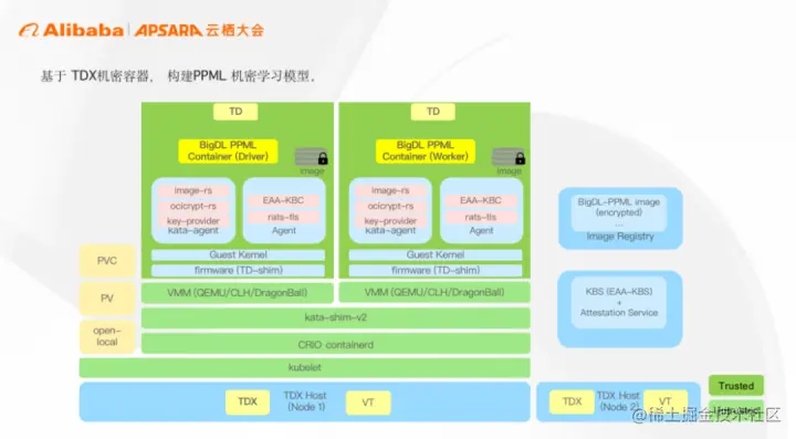其次,在 TDX 可信执行环境里,执行远程证明并获取验证/解密容器镜像所需的密钥,镜像服务下载容器镜像,使用密钥验证及解密容器镜像;在数据方面,用户使用标准的 K8s CSI driver 比如 open-local 为容器挂载高性能本地 LVM 卷,机密容器会自动进行透明的加密存储来保护用户输入输出数据。