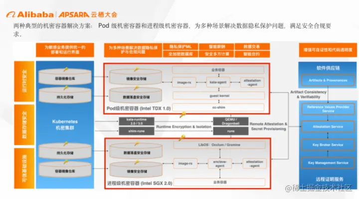 龙蜥社区理事单位之一的阿里云是机密容器(Confidential Containers)项目的核心参与者,在参与开源项目开发的同时,也一直在推动机密容器的商用解决方案,目前已经完成了两种机密容器的解决方案构建: