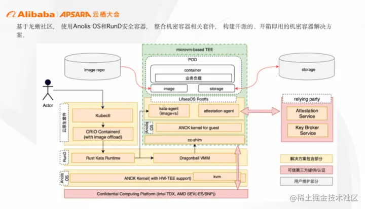 英特尔和阿里云一直保持着紧密合作,两家都是 CoCo 上游社区的发起人,共同定义、设计和实现了 CoCo 软件栈的诸多关键特性,比如 TEE 内镜像下载,镜像的验签和解密,可信临时存储和可度量运行时环境,所有这一切都确保了 CoCo 这个项目的强安全属性。