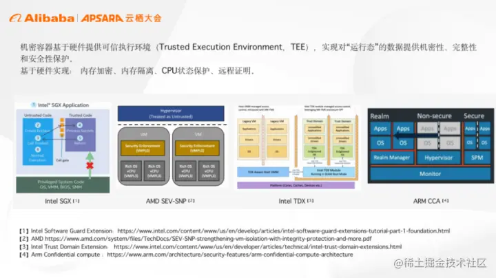 近年来很多硬件厂商也推出了自己的 TEE 技术解决方案,比如英特尔® SGX 和 TDX 等,这意味着我们可以基于多种硬件平台构建机密容器技术。