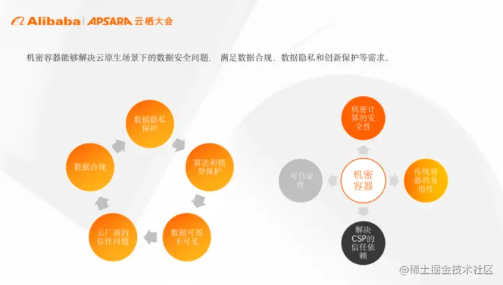 机密容器是 CNCF 的 一个 Sandbox 项目,用于解决云原生场景下的数据安全问题,满足数据合规、数据隐私保护、算法和模型等创新 IP 保护,数据可用但是不可见等使用需求,以及解决云厂商的信任依赖问题。