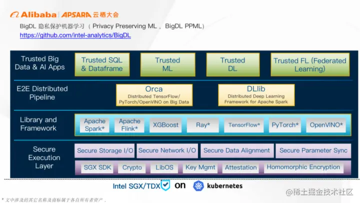 BigDL 是英特尔开源的一款人工智能解决方案平台,能够方便数据科学家和数据工程师便捷地开发出一套端到端的分布式人工智能的应用。另外,BigDL 特别针对机密计算推出了 PPML (隐私保护机器学习),能够对分布式人工智能应用实现端到端的全链路保护。