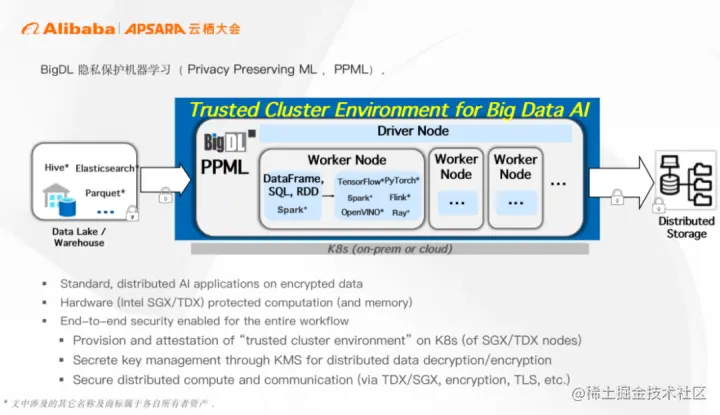 如上图所示,BigDL PPML 基于可信的 Kubernetes 集群环境,通过机密容器技术能够构建出基于 TDX 的分布式可执行环境,从而确保业务、数据和模型在使用和计算过程中的安全性,包括不可见以及不可更改性。