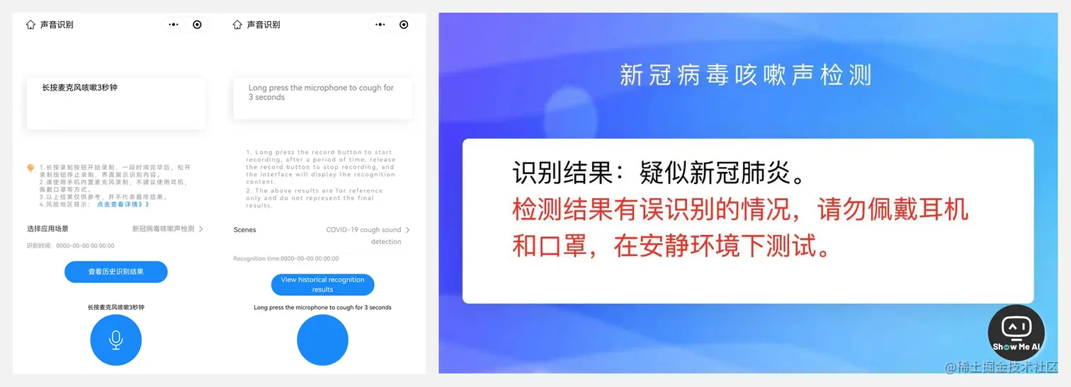 一款名为“Thinkit声音识别”的微信小程序,实现通过声音识别新冠患者的功能。小程序有中英两种语言的版本,你只需长按麦克风咳嗽3秒钟,就可以等待系统的检测结果。找2位阳了的朋友进行了测试,检测结果均为“疑似新冠肺炎”,所以准确率应该可以。