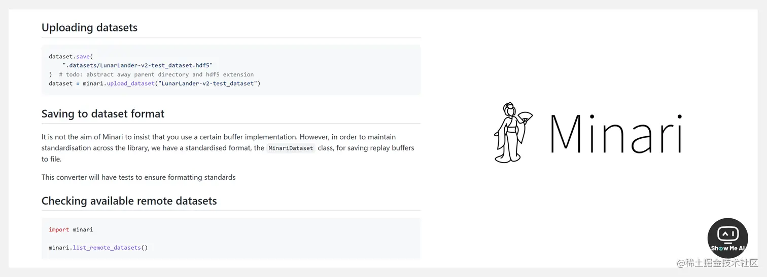 Minari(原名 Kabuki)旨在成为一个用于进行离线强化学习研究的 Python 库,类似于 Gymnasium 的离线版本或 HugginFace 数据集库的离线RL版本。