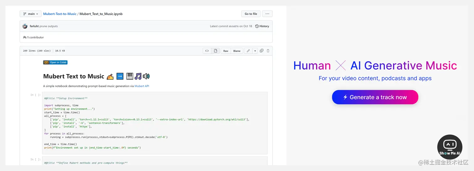 Mubert Text to Music 是一个深度学习实现,可以基于 Mubert API 根据文字提示自动生成音乐。每次发送请求时,API 都会生成一个独特的音乐组合,且基本不会重复(因为音乐不是从已有曲目数据库中提取的,而是在请求时创建的)。