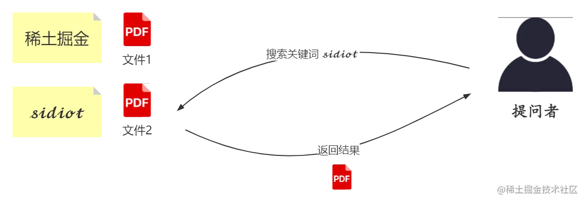方法二:在刚拿到所有材料时,就把它们通读一遍,然后构建关键词和文章的对应关系。当用户在搜索特定词的时候,比如 𝓼𝓲𝓭𝓲𝓸𝓽,就会直接返回 𝓼𝓲𝓭𝓲𝓸𝓽 这个 关键词索引 下的文章列表。先构造索引的好处就是,能够将这种索引放在后续的搜索中复用,搜索也就变成了一种词语匹配加返回索引材料的过程了。