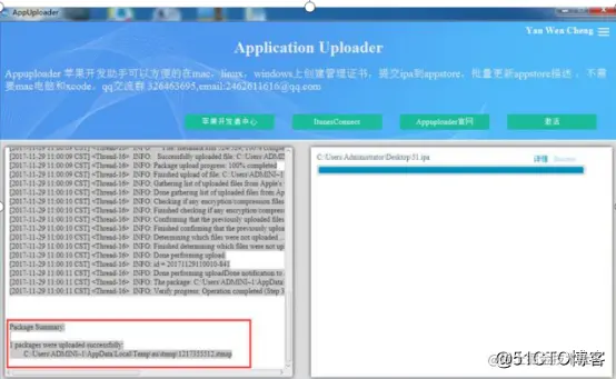 6.3Appuploader将自动上传你的IPA,包如果很大需要上传一段时间,当出现以下提示时(packages were uploaded successfully 进度条蓝色),说明上传成功。
