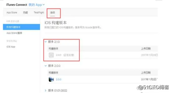 **进入APP,点击活动,所有构建版本选项(下图所示) ,这里会显示上传成功的构建版本,如果ipa包没问题刚上传会显示****正在处理! **
