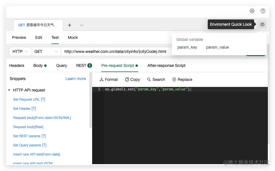 可以通过点击页面右上角预览环境按钮来查看当前的自定义全局变量值,如下图