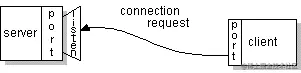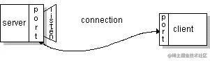 首先服务器(server)上有一个socket绑定了80端口(80端口是为HTTP超文本传输协议开放的端口),服务器会一直等待,直到有客户端(client)向服务端发送了连接请求
