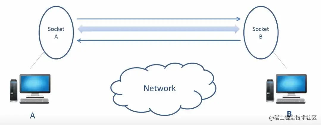 如果有计算机A想要和计算机B通过网络进行通信,那么计算机A中必须要有一个socket,计算机B也要有一个socket,这两个socket一旦进行连接,计算机A就能向计算机B发送接收数据,计算机B也能向计算机A发送接收数据了。计算机A向计算机B发送数据,就会用到SocketA的OutputStream,计算机A接收计算机B的数据,就会用到Socket的InputStream。