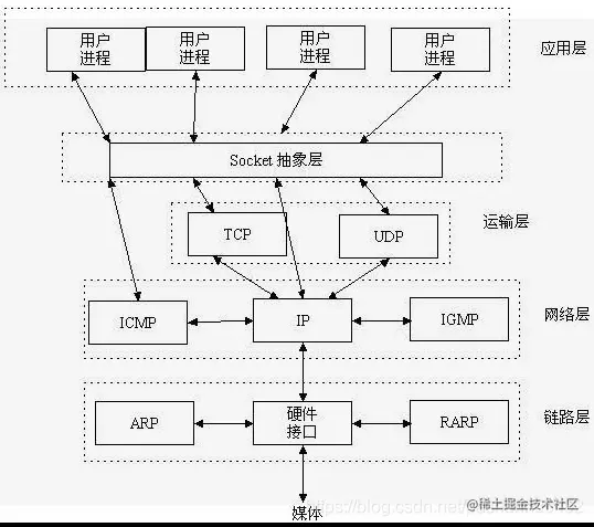 说了这么多,那socket在哪里呢? 从图中可以看出,Socket是应用层与TCP/IP协议族通信的中间软件抽象层,它是一组接口(API)。我们所说的TCP/IP网站栈是在操作系统内核实现的,而Socket就是操作系统内核提供给应用层的一系列接口,Socket封装了TCP/IP,要使用TCP/IP来发送数据,就调用Socket的OutputStream,要使用TCP/IP接收数据,就调用Socket的InputStream,现在大家应该对TCP/IP与Socket的关系有所了解了吧。
