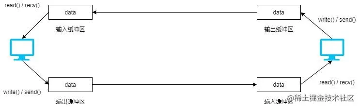 计算机A想发数据到计算机B,首先计算机A把用户态的数据拷贝到内核态的输出缓冲区,再由把输出缓冲区的数据通过互联网发送到计算机B的输入缓冲区,计算机B把输入缓冲区的数据拷贝到用户态,就完成了一次数据的发送和接收。