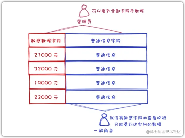 列权限:按照字段过滤,常用场景比如一些敏感字段数据不适合某些角色人查看及使用,像是销售金额、客户身份信息等;