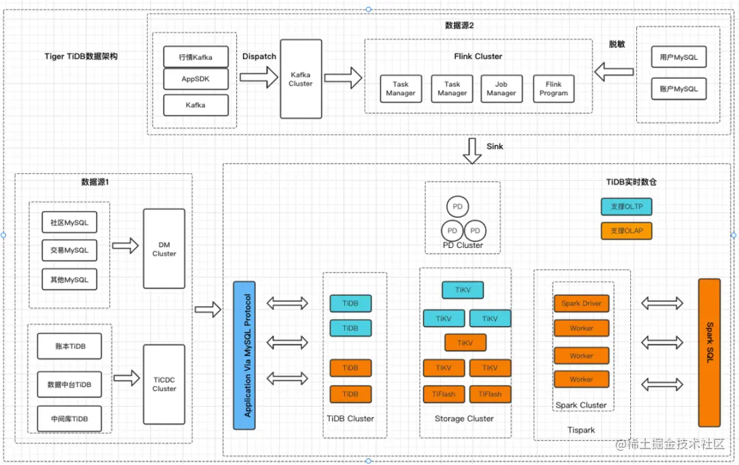 现在,老虎国际的数据架构整体可以分为三部分:第一,将分布在各业务系统甚至 APP 内的数据进行收集;第二,进行数据处理;第三,将数据持久化存储。非敏感数据通过 DM 和 CDC 快速同步到 TiDB,敏感数据通过 Flink 进行脱敏后输入 TiDB,利用 TiDB HTAP 的能力构建数据中台和实时数仓,既保证 OLTP 查询时系统的稳定性,又保证 OLAP 的快速分析,两者同时存在又保证隔离,兼顾安全和稳定。最后,老虎国际还将 TiDB 作为类似数据湖的概念提供数据源给下游的 HDFS 使用,对外提供更多数据服务。