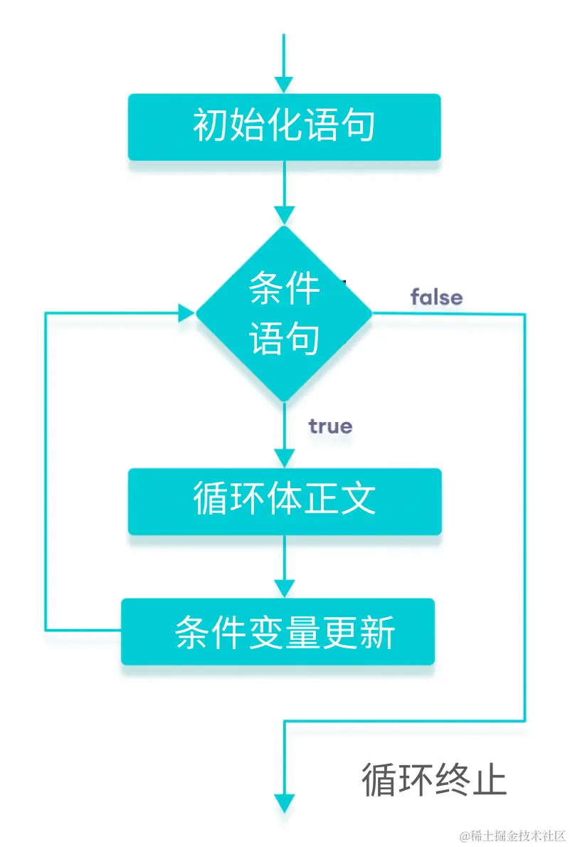- 条件:条件逻辑,仅当条件为真时才执行循环体如果为false,则循环的流程跳出循环。