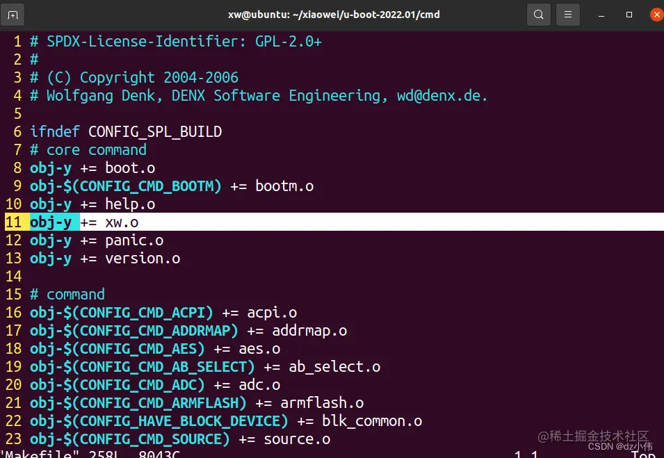在u-boot-2022.01/cmd下,新建文件xw.c