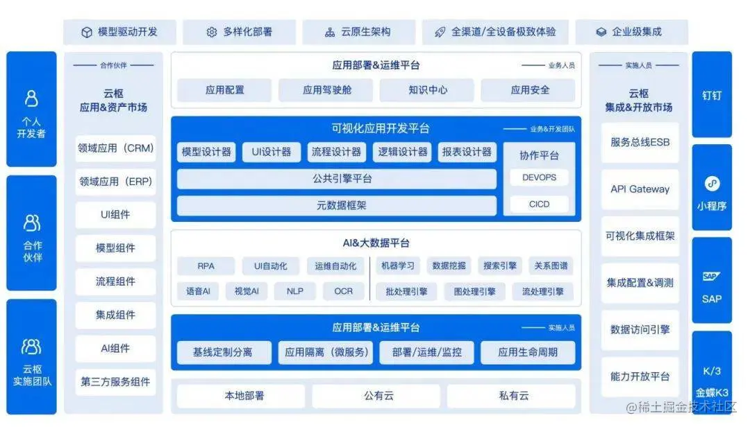 以奥哲旗下的云枢低代码平台为例,其为专业开发人员和一线业务人员提供低门槛的开发技能组合。