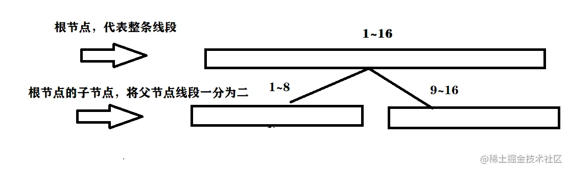 对于每个结点,我们将它代表的区间(线段)平均的分为两个小区间,从而建立左右孩子,以此类推