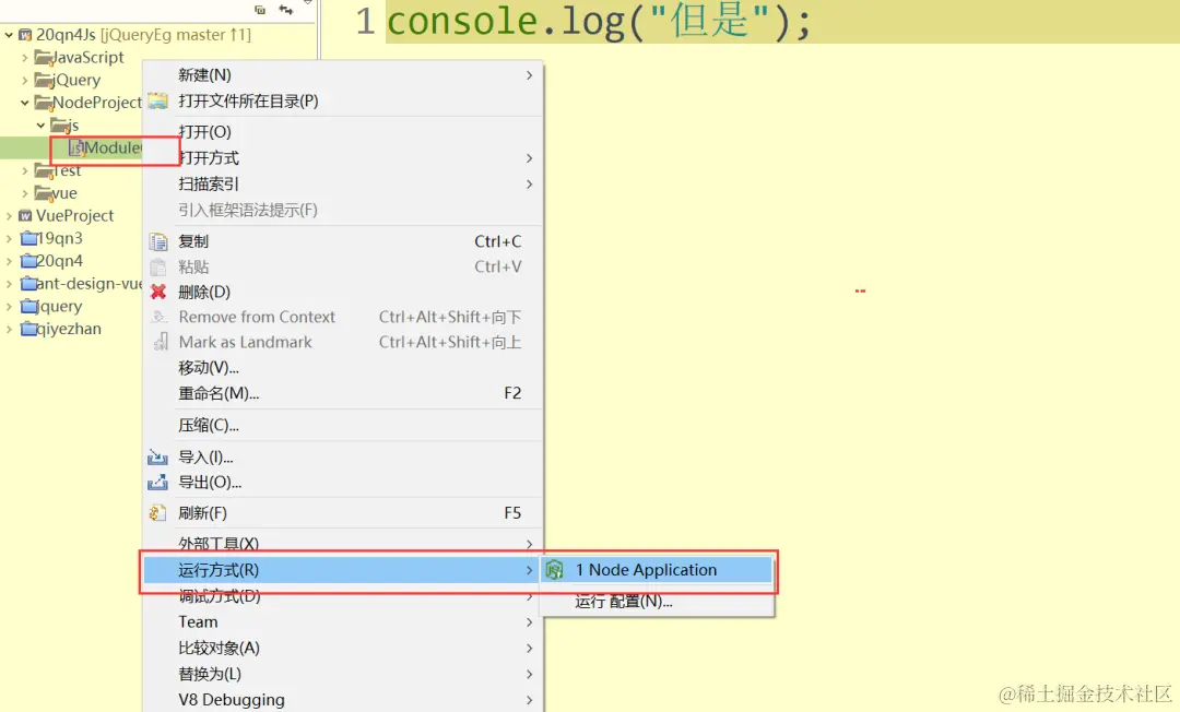 右击js文件, 点击外部工具,选择==cmd== ,这个时候就会打开控制台,然后在控制台中输入node js文件名.js回车即可。