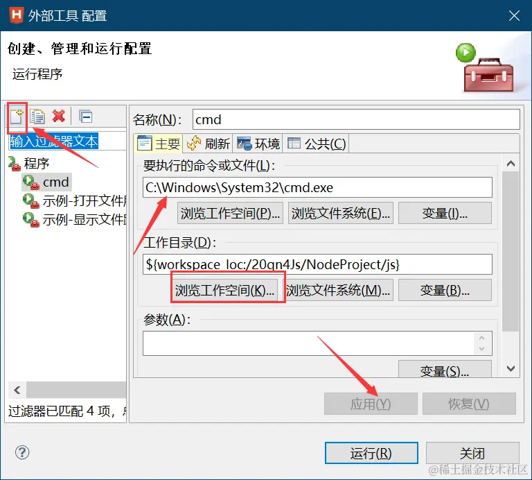 点击==运行==,选择外部工具,选择外部工具配置 ,点击新建 ,起个名字比如叫【cmd】 ,在要执行的命令活文件里面写C:\Windows\System32\cmd.exe ,然后下面的浏览工作空间 ,直接选择当前需要操作的项目即可。