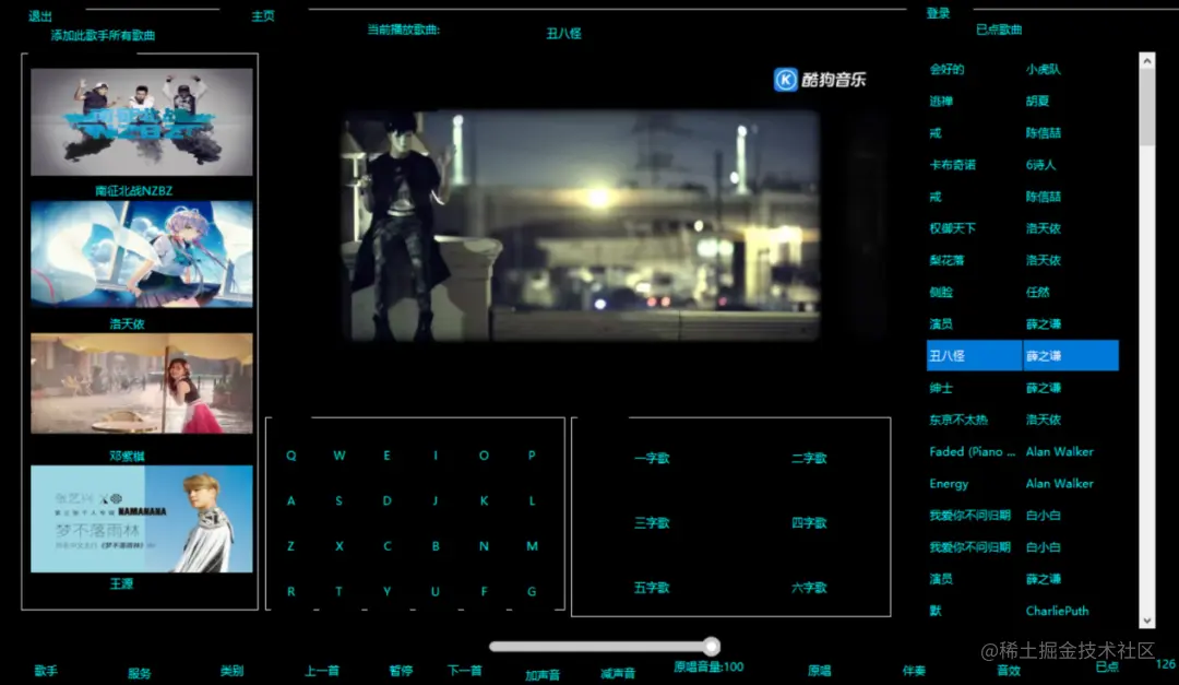 - 实现了对歌曲的暂停播放,切换,重唱,音量加减,唱歌,返回主页,上一首,下一首的功能