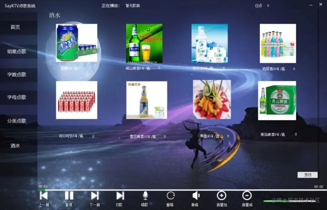 由右边的酒水,点歌等字样组成的类似于导航栏的功能